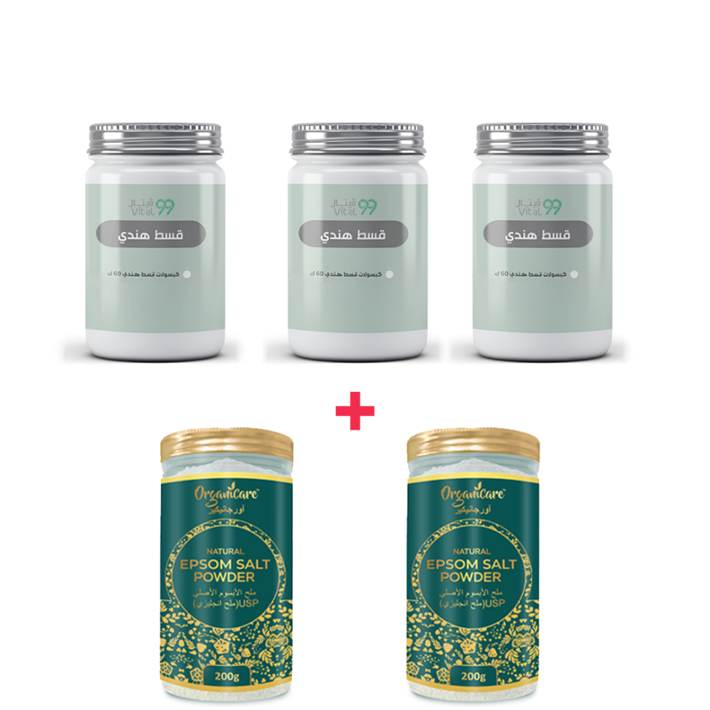 بكج الدورة الشهرية هو الحل الطبيعي لدعم تنظيم الهرمونات وعلاج اضطرابات الدورة الشهرية بفعالية وأمان. يحتوي البكج على 3 علب من كبسولات القسط الهندي النقي 100%، المصنوع بجودة عالية وخالٍ من أي إضافات أو مواد حافظة، + 2 عبوة من ملح إبسوم الطبيعي غير المعطر (400 جم) لتعزيز الراحة والاسترخاء خلال فترة الدورة وبعدها.